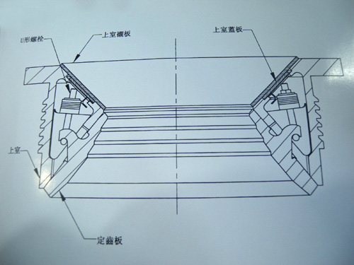 复合圆锥破碎机定齿板(扎臼壁)的更换:首先拆下圆锥破碎机的帽架,旋下安装在上架上的上室。然后用吊车吊起上室,逆时针旋转便可以很容易的拆下来。拆下上室衬板、上室盖板和U形螺栓后就可以取下定齿板。清洗上室和上架的螺纹并涂上高压润滑脂。